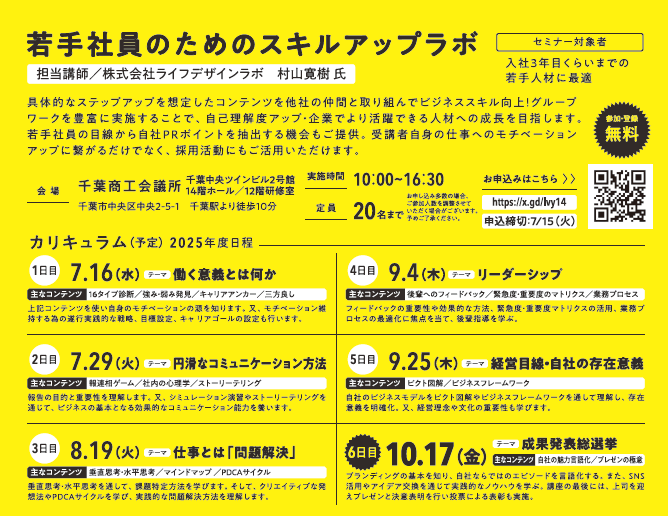 若手社員が自身の職務や自社の魅力に気づき、ビジネスマインドを高めることを目的として、昨年度に続き株式会社ライフデザインラボの村山寛樹氏を講師としてお迎えし、7月から10月にかけて全6回実施しました。